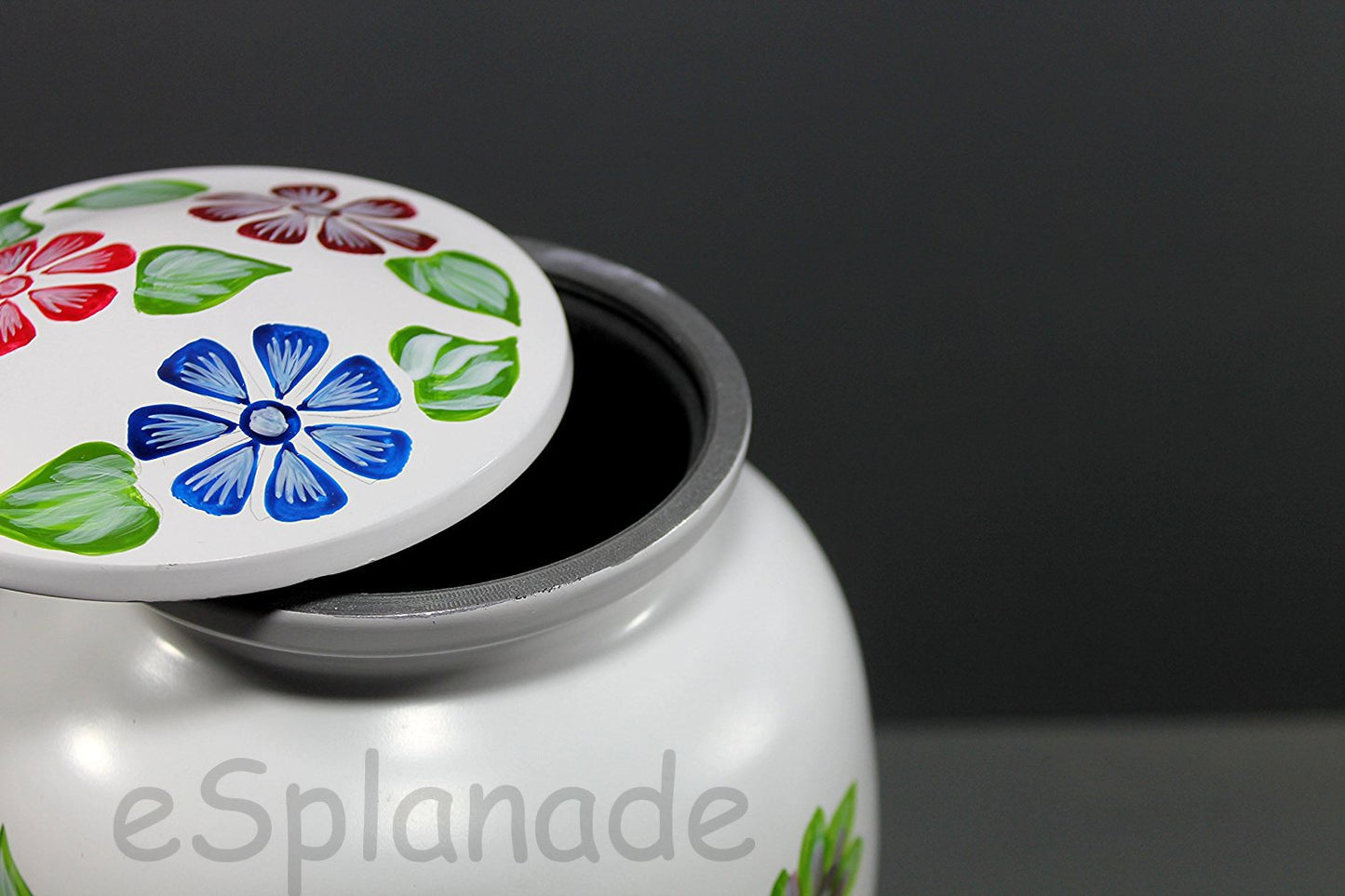 - Capacity: 3300 ml / 200 cubic inches. Product Details: Colour: Blue, Multicolor, Brown, White. Floral Print; Material: Metal; Dimensions: 10" H x 6" W; Weight: 1.2 Kgs. Approx., Closure: Threaded Lid.