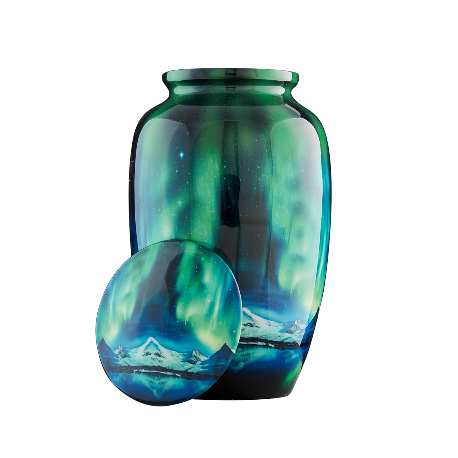 Esplanade Metal Urn for Ashes Adult Male Female – 10" Cremation Urn for Human Ashes, Full Size Large Urn, Aurora Northern Lights Mountains Blue Colour, Funeral Vase with Velvet Bag - for 80kg Adult