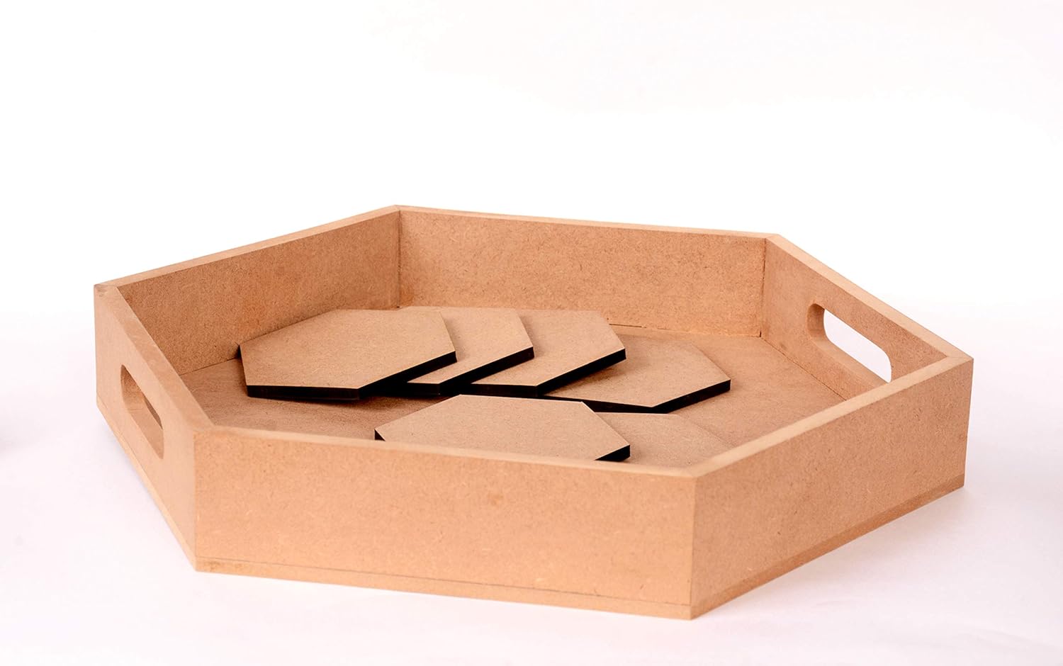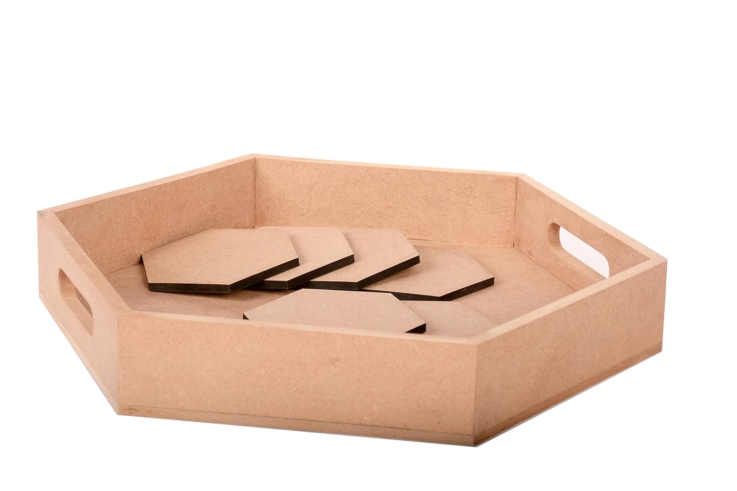- PACKAGE CONTENTS: Pack of 1 plain MDF Tray and 6 plain MDF coasters in Hexagon shape for decoration, Size: Tray - Simple and smart design of 10.5 in X 10.5 in X 1.5in, Coaster - 3 in X 3 in X .25in, Colour: Brown