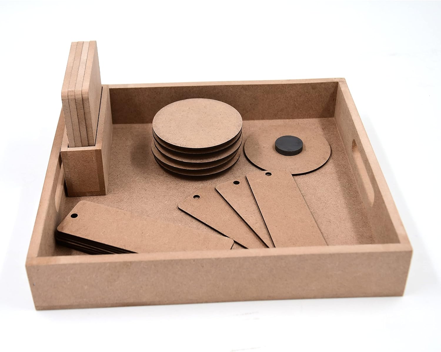 IVEI DIY MDF Rectangular Tray Pack with 4 Coaster with Stand, 10 Round Magnets and 10 Bookmarks