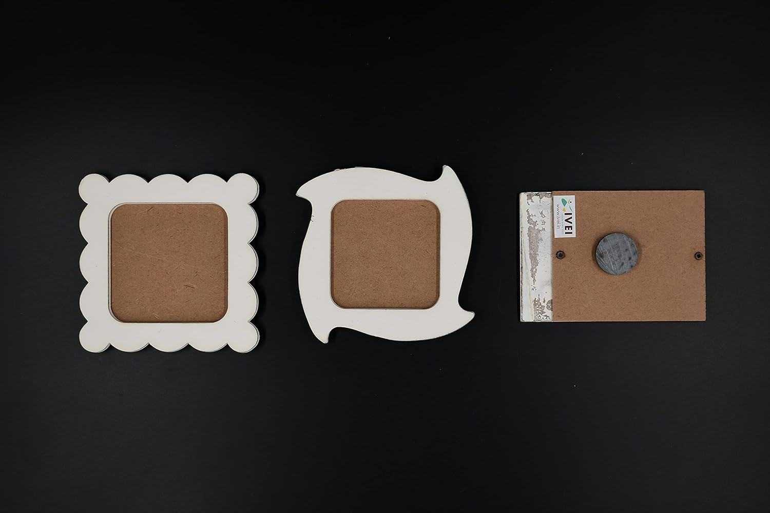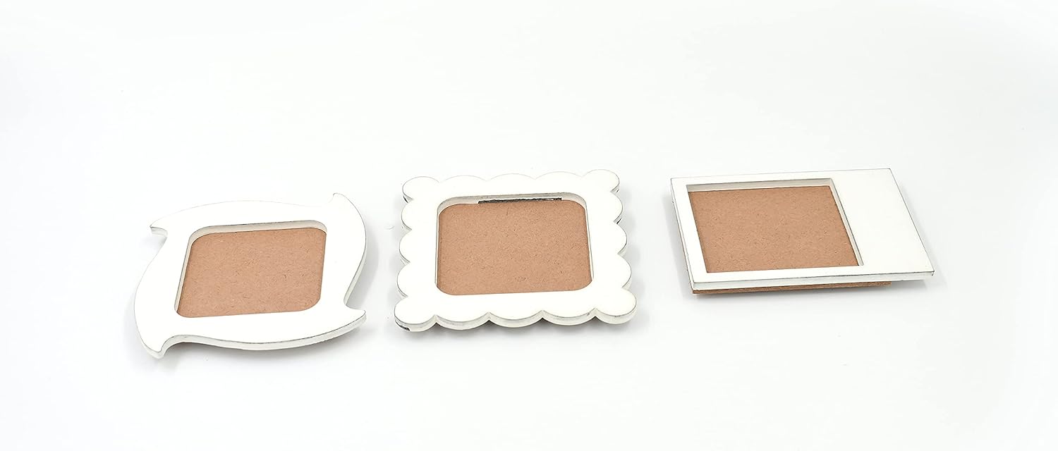 - PACKAGE CONTENTS: Set of 3 different shaped photo magnets MDF cutouts with primer. Size: Polaroid: 4in X 3in X 0.5 in: Photo Size: 2.7 in by 2.5 in Square: 4 in X 4 in X 0.5 C in: Photo Size: 2.5 in X 2.5 in: Scallop: 4 in X 4 in X 0.5 in: Photo Size: 2.75 in X 2.75 in Colour: Off-White.