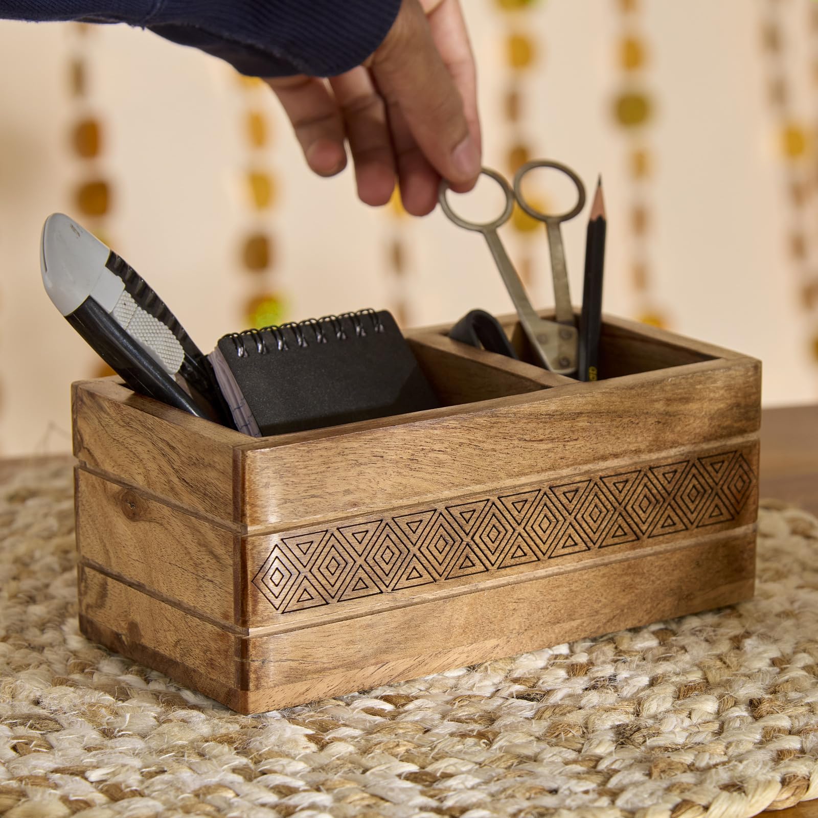 KLEO Wooden Organizer Stand Caddy - Mango Wood Cutlery Holder, Tableware Storage Box for Kitchen, Dining Table | Spoon, Knife, Fork, Chopstick, Spices Organizer | Pen Stand & Stationery Box