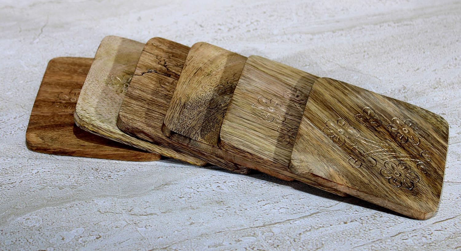 StonKraft Square Wooden Coasters for Tea & Coffee – Handmade Set of 6 | Handicraft Tabletop Decorative Coasters for Office, Home, Bar