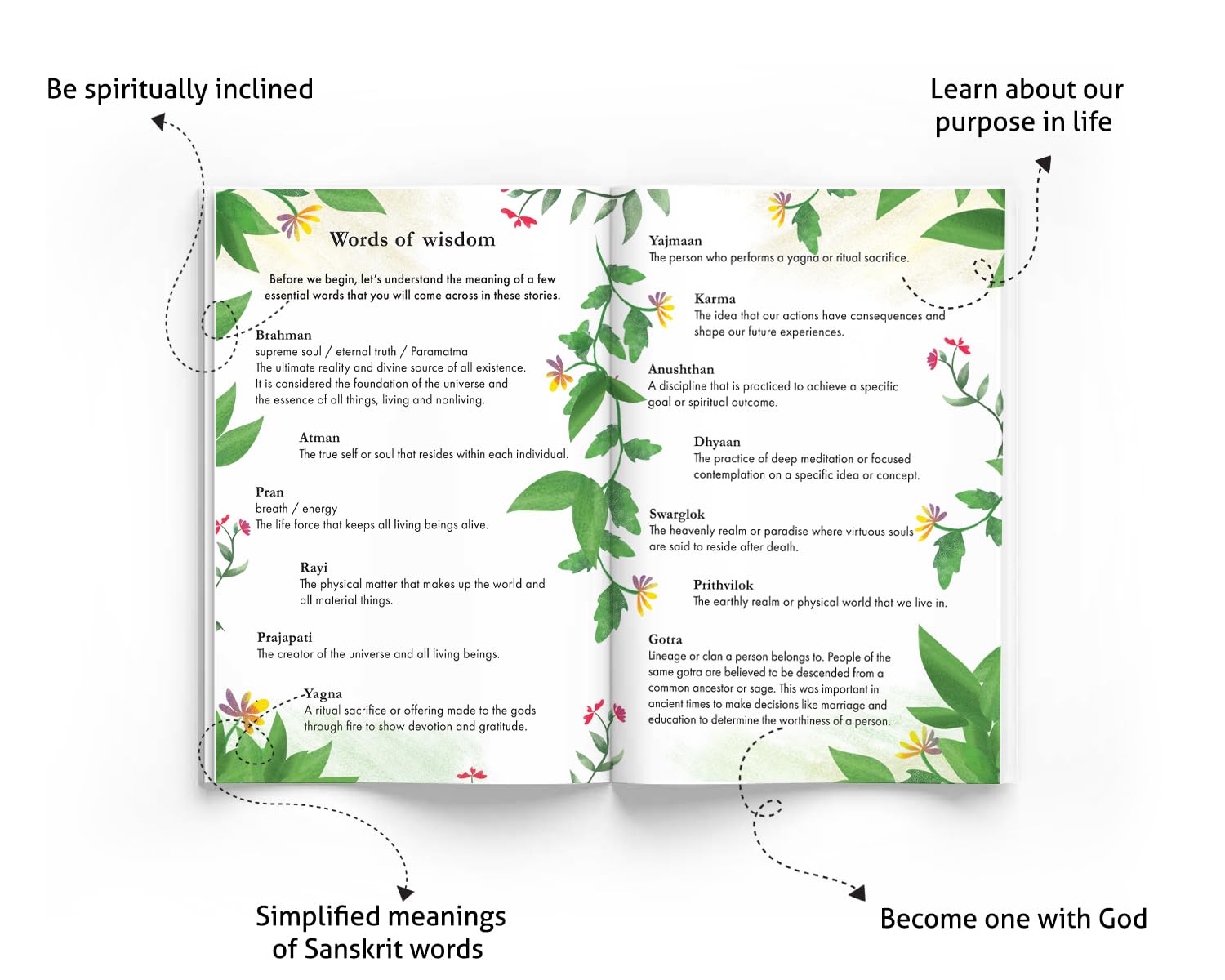 Explore the ancient wisdom of the Upanishads through ten captivating stories, each revealing truths about the self (Atman) and its connection to the universe (Brahman). Within these tales lies a hidden challenge - a riddle to solve, with the answer hidden in a single word representing a virtue. As you journey through each story, uncover timeless lessons about existence and morality, gaining insights that resonate with seekers across generations. Additionally, you will discover a detailed page explaining all the Sanskrit words, enhancing the reading experience and deepening your immersion into the profound teachings of the Upanishads.